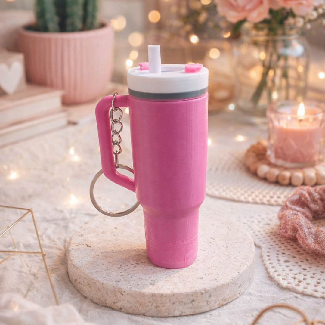 Um chaveiro criativo e cheio de estilo inspirado nos famosos copos térmicos! Além de decorar suas chaves, bolsa ou mochila, ele também funciona como um porta batom ou brilho labial, mantendo seu item sempre à mão.